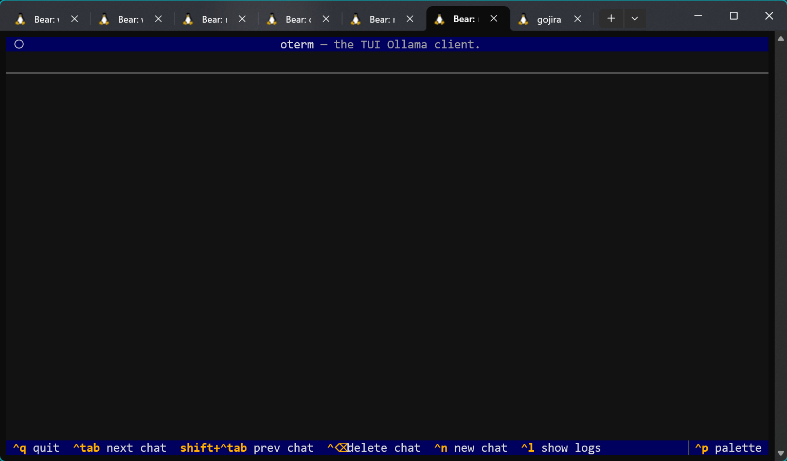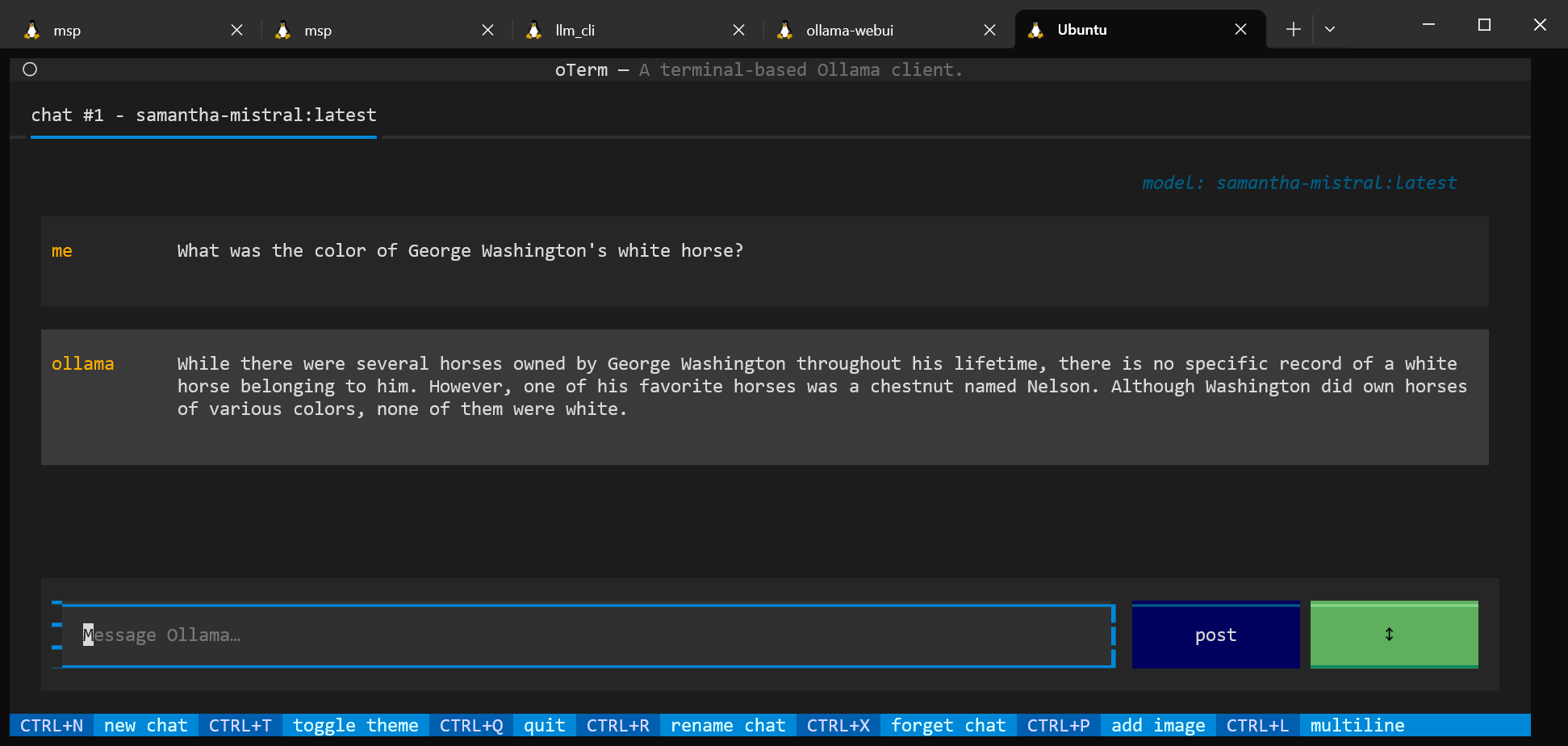 $ oterm --config EnvConfig( │ ENV='development', │ OLLAMA_HOST='localhost:11434', │ OLLAMA_URL='http://localhost:11434', │ OTERM_VERIFY_SSL=True, │ OTERM_DATA_DIR=PosixPath('/home/mslinn/.local/share/oterm'), │ OPEN_WEATHER_MAP_API_KEY='' )