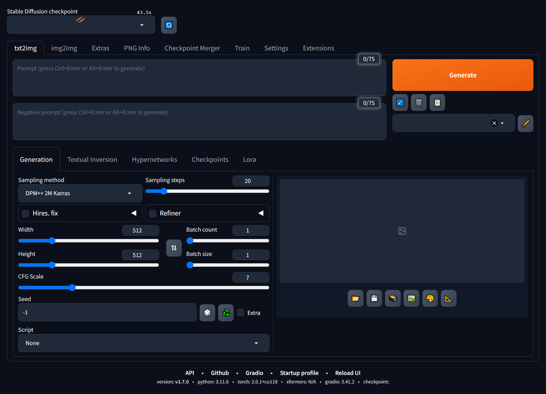 $ bash webui.sh ################################################################ Install script for stable-diffusion + Web UI Tested on Debian 11 (Bullseye), Fedora 34+ and openSUSE Leap 15.4 or newer. ################################################################ ################################################################ Running on mslinn user ################################################################ ################################################################ Clone stable-diffusion-webui ################################################################ Cloning into 'stable-diffusion-webui'... remote: Enumerating objects: 30495, done. remote: Total 30495 (delta 0), reused 0 (delta 0), pack-reused 30495 Receiving objects: 100% (30495/30495), 33.36 MiB | 6.79 MiB/s, done. Resolving deltas: 100% (21359/21359), done. ################################################################ python venv already activate or run without venv: /mnt/f/work/llm/stable/venv ################################################################ ################################################################ Launching launch.py... ################################################################ Python 3.8.5 (default, Sep 4 2020, 07:30:14) [GCC 7.3.0] Version: v1.7.0 Commit hash: cf2772fab0af5573da775e7437e6acdca424f26e Installing clip Installing open_clip Cloning Stable Diffusion into /mnt/f/work/llm/stable/stable-diffusion-webui/repositories/stable-diffusion-stability-ai... Cloning into '/mnt/f/work/llm/stable/stable-diffusion-webui/repositories/stable-diffusion-stability-ai'... remote: Compressing objects: 100% (311/311), done. remote: Total 580 (delta 279), reused 452 (delta 248), pack-reused 0 Receiving objects: 100% (580/580), 73.44 MiB | 6.84 MiB/s, done. Resolving deltas: 100% (279/279), done. Updating files: 100% (135/135), done. Cloning Stable Diffusion XL into /mnt/f/work/llm/stable/stable-diffusion-webui/repositories/generative-models... Cloning into '/mnt/f/work/llm/stable/stable-diffusion-webui/repositories/generative-models'... remote: Enumerating objects: 860, done. remote: Counting objects: 100% (513/513), done. remote: Compressing objects: 100% (246/246), done. remote: Total 860 (delta 365), reused 306 (delta 263), pack-reused 347 Receiving objects: 100% (860/860), 42.67 MiB | 7.36 MiB/s, done. Resolving deltas: 100% (436/436), done. Cloning K-diffusion into /mnt/f/work/llm/stable/stable-diffusion-webui/repositories/k-diffusion... Cloning into '/mnt/f/work/llm/stable/stable-diffusion-webui/repositories/k-diffusion'... remote: Enumerating objects: 1329, done. remote: Counting objects: 100% (611/611), done. remote: Compressing objects: 100% (81/81), done. remote: Total 1329 (delta 568), reused 538 (delta 530), pack-reused 718 Receiving objects: 100% (1329/1329), 239.04 KiB | 1.07 MiB/s, done. Resolving deltas: 100% (931/931), done. Cloning CodeFormer into /mnt/f/work/llm/stable/stable-diffusion-webui/repositories/CodeFormer... Cloning into '/mnt/f/work/llm/stable/stable-diffusion-webui/repositories/CodeFormer'... remote: Enumerating objects: 594, done. remote: Counting objects: 100% (245/245), done. remote: Compressing objects: 100% (88/88), done. remote: Total 594 (delta 175), reused 173 (delta 157), pack-reused 349 Receiving objects: 100% (594/594), 17.31 MiB | 2.92 MiB/s, done. Resolving deltas: 100% (286/286), done. Cloning BLIP into /mnt/f/work/llm/stable/stable-diffusion-webui/repositories/BLIP... Cloning into '/mnt/f/work/llm/stable/stable-diffusion-webui/repositories/BLIP'... remote: Enumerating objects: 277, done. remote: Counting objects: 100% (165/165), done. remote: Compressing objects: 100% (30/30), done. remote: Total 277 (delta 137), reused 136 (delta 135), pack-reused 112 Receiving objects: 100% (277/277), 7.03 MiB | 3.12 MiB/s, done. Resolving deltas: 100% (152/152), done. Installing requirements for CodeFormer Installing requirements Launching Web UI with arguments: no module 'xformers'. Processing without... no module 'xformers'. Processing without... No module 'xformers'. Proceeding without it. Style database not found: /mnt/f/work/llm/stable/stable-diffusion-webui/styles.csv Downloading: "https://huggingface.co/runwayml/stable-diffusion-v1-5/resolve/main/v1-5-pruned-emaonly.safetensors" to /mnt/f/work/llm/stable/stable-diffusion-webui/models/Stable-diffusion/v1-5-pruned-emaonly.safetensors 100%|██████████████████████████████████████████████████████| 3.97G/3.97G [00:42<00:00, 101MB/s] Calculating sha256 for /mnt/f/work/llm/stable/stable-diffusion-webui/models/Stable-diffusion/v1-5-pruned-emaonly.safetensors: Running on local URL: http://127.0.0.1:7860 To create a public link, set `share=True` in `launch()`. 6ce0161689b3853acaa03779ec93eafe75a02f4ced659bee03f50797806fa2fa Loading weights [6ce0161689] from /mnt/f/work/llm/stable/stable-diffusion-webui/models/Stable-diffusion/v1-5-pruned-emaonly.safetensors Creating model from config: /mnt/f/work/llm/stable/stable-diffusion-webui/configs/v1-inference.yaml vocab.json: 100%|███████████████████████████████████████████████████████████████| 961k/961k [00:00<00:00, 21.9MB/s] merges.txt: 100%|███████████████████████████████████████████████████████████████| 525k/525k [00:00<00:00, 117MB/s] special_tokens_map.json: 100%|█████████████████████████████████████████████████████████████| 389/389 [00:00<00:00, 4.56MB/s] tokenizer_config.json: 100%|█████████████████████████████████████