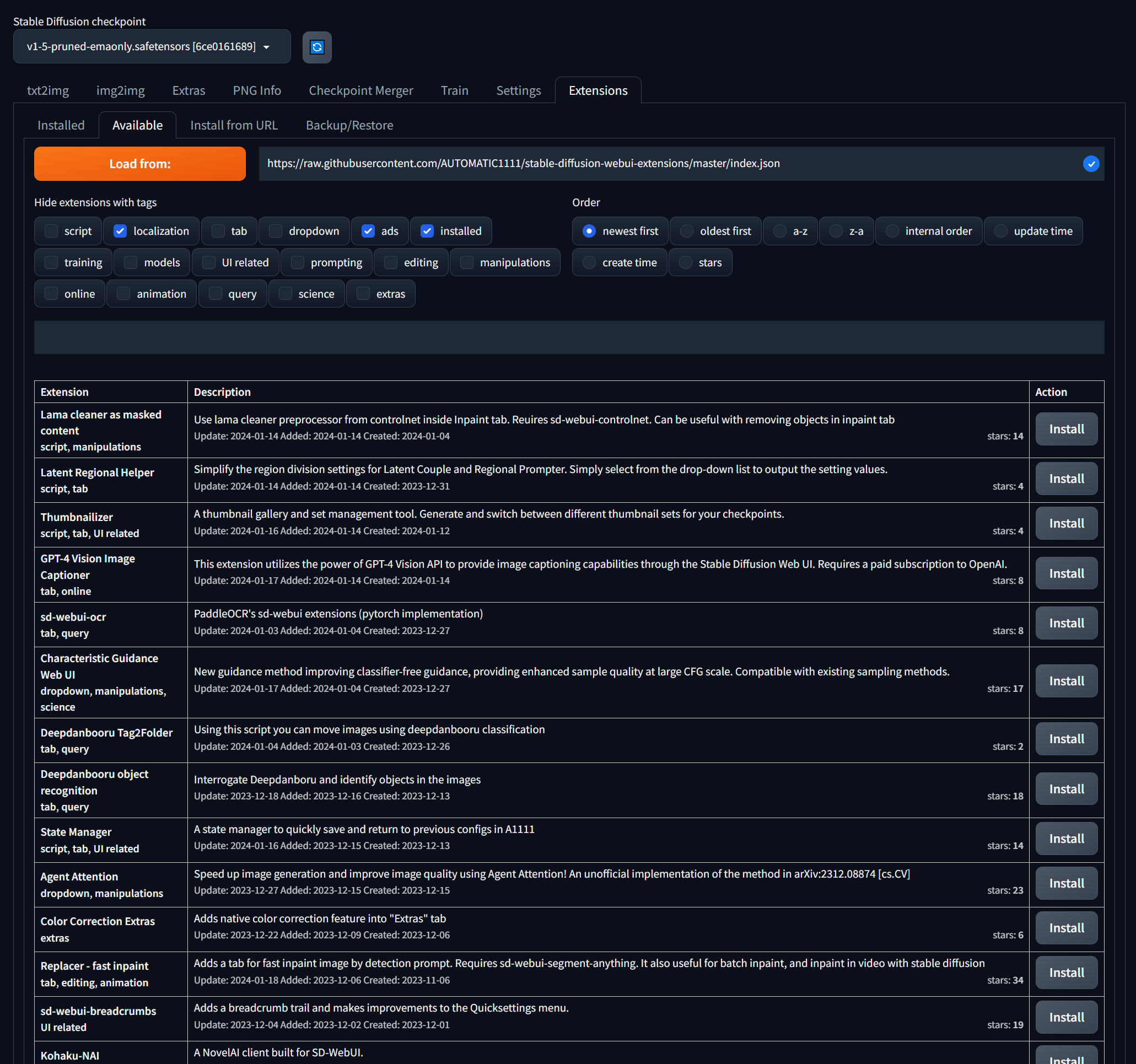 Each extension has a Install button on the right.