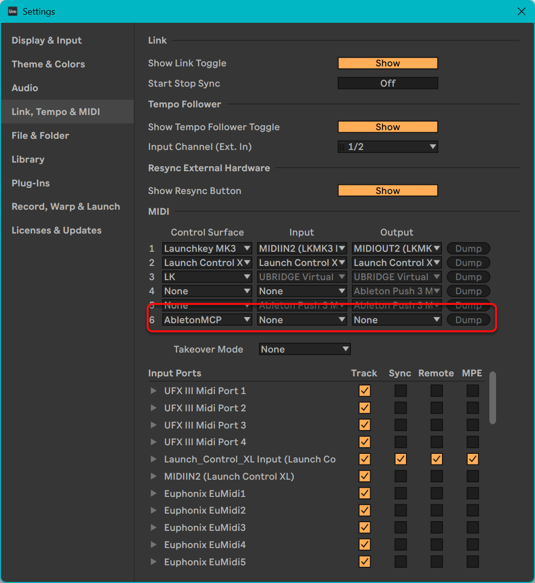Notice that the Input Ports and Output Ports sections below the Control Surface section do not mention AbletonMCP because it does not use MIDI.