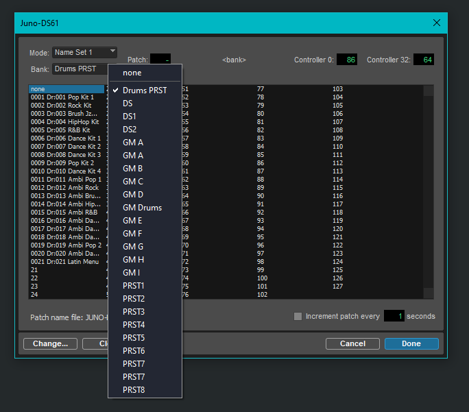 JUNO-DS.midnam<?xml version="1.0" encoding="UTF-8"?> <!DOCTYPE MIDINameDocument PUBLIC "-//MIDI Manufacturers Association//DTD MIDINameDocument 1.0//EN" "http://www.midi.org/dtds/MIDINameDocument10.dtd"> <MIDINameDocument> <Author>Roland Patch Script Builder - Created by Jeff Gibbs</Author> <MasterDeviceNames> <Manufacturer>Roland</Manufacturer> <Model>JUNO-DS</Model> <CustomDeviceMode Name="" > <ChannelNameSetAssignments> <ChannelNameSetAssign Channel="1" NameSet="Name Set 1" /> <ChannelNameSetAssign Channel="2" NameSet="Name Set 1" /> <ChannelNameSetAssign Channel="3" NameSet="Name Set 1" /> <ChannelNameSetAssign Channel="4" NameSet="Name Set 1" /> <ChannelNameSetAssign Channel="5" NameSet="Name Set 1" /> <ChannelNameSetAssign Channel="6" NameSet="Name Set 1" /> <ChannelNameSetAssign Channel="7" NameSet="Name Set 1" /> <ChannelNameSetAssign Channel="8" NameSet="Name Set 1" /> <ChannelNameSetAssign Channel="9" NameSet="Name Set 1" /> <ChannelNameSetAssign Channel="10" NameSet="Name Set 1" /> <ChannelNameSetAssign Channel="11" NameSet="Name Set 1" /> <ChannelNameSetAssign Channel="12" NameSet="Name Set 1" /> <ChannelNameSetAssign Channel="13" NameSet="Name Set 1" /> <ChannelNameSetAssign Channel="14" NameSet="Name Set 1" /> <ChannelNameSetAssign Channel="15" NameSet="Name Set 1" /> <ChannelNameSetAssign Channel="16" NameSet="Name Set 1" /> </ChannelNameSetAssignments> </CustomDeviceMode> <ChannelNameSet Name="Name Set 1" > <AvailableForChannels> <AvailableChannel Channel="1" Available="true" /> <AvailableChannel Channel="2" Available="true" /> <AvailableChannel Channel="3" Available="true" /> <AvailableChannel Channel="4" Available="true" /> <AvailableChannel Channel="5" Available="true" /> <AvailableChannel Channel="6" Available="true" /> <AvailableChannel Channel="7" Available="true" /> <AvailableChannel Channel="8" Available="true" /> <AvailableChannel Channel="9" Available="true" /> <AvailableChannel Channel="10" Available="true" /> <AvailableChannel Channel="11" Available="true" /> <AvailableChannel Channel="12" Available="true" /> <AvailableChannel Channel="13" Available="true" /> <AvailableChannel Channel="14" Available="true" /> <AvailableChannel Channel="15" Available="true" /> <AvailableChannel Channel="16" Available="true" /> </AvailableForChannels> <PatchBank Name="Drums PRST" > <MIDICommands> <ControlChange Control="0" Value="86" /> <ControlChange Control="32" Value="64" /> </MIDICommands> <PatchNameList> <Patch Number="Drums PRST-1" Name="0001 Dr:001 Pop Kit 1" ProgramChange="0" /> <Patch Number="Drums PRST-2" Name="0002 Dr:002 Rock Kit" ProgramChange="1" /> <Patch Number="Drums PRST-3" Name="0003 Dr:003 Brush Jz Kit " ProgramChange="2" /> <Patch Number="Drums PRST-4" Name="0004 Dr:004 HipHop Kit" ProgramChange="3" /> <Patch Number="Drums PRST-5" Name="0005 Dr:005 R&B Kit" ProgramChange="4" /> <Patch Number="Drums PRST-6" Name="0006 Dr:006 Dance Kit 1" ProgramChange="5" /> <Patch Number="Drums PRST-7" Name="0007 Dr:007 Dance Kit 2" ProgramChange="6" /> <Patch Number="Drums PRST-8" Name="0008 Dr:008 Dance Kit 3" ProgramChange="7" /> <Patch Number="Drums PRST-9" Name="0009 Dr:009 Pop Kit 2" ProgramChange="8" /> <Patch Number="Drums PRST-10" Name="0010 Dr:010 Dance Kit 4" ProgramChange="9" /> <Patch Number="Drums PRST-11" Name="0011 Dr:011 Ambi Pop 1" ProgramChange="10" /> <Patch Number="Drums PRST-12" Name="0012 Dr:012 Ambi Rock" ProgramChange="11" /> <Patch Number="Drums PRST-13" Name="0013 Dr:013 Ambi BrushJz" ProgramChange="12" /> <Patch Number="Drums PRST-14" Name="0014 Dr:014 Ambi HipHop" ProgramChange="13" /> <Patch Number="Drums PRST-15" Name="0015 Dr:015 Ambi R&B" ProgramChange="14" /> <Patch Number="Drums PRST-16" Name="0016 Dr:016 Ambi Dance 1" ProgramChange="15" /> <Patch Number="Drums PRST-17" Name="0017 Dr:017 Ambi Dance 2" ProgramChange="16" /> <Patch Number="Drums PRST-18" Name="0018 Dr:018 Ambi Dance 3 " ProgramChange="17" /> <Patch Number="Drums PRST-19" Name="0019 Dr:019 Ambi Pop 2" ProgramChange="18" /> <Patch Number="Drums PRST-20" Name="0020 Dr:020 Ambi Dance 4" ProgramChange="19" /> <Patch Number="Drums PRST-21" Name="0021 Dr:021 Latin Menu" ProgramChange="20" /> </PatchNameList> </PatchBank> <PatchBank Name="DS" > <MIDICommands> <ControlChange Control="0" Value="86" /> <ControlChange Control="32" Value="65" /> </MIDICommands> <PatchNameList> <Patch Number="DS-1" Name="0001 Dr:S01 StudioKt DS1" ProgramChange="0" /> <Patch Number="DS-2" Name="0002 Dr:S02 StudioKt DS2" ProgramChange="1" /> <Patch Number="DS-3" Name="0003 Dr:S03 EEU-Oriental" ProgramChange="2" /> <Patch Number="DS-4" Name="0004 Dr:S04 808 Kit " ProgramChange="3" /> <Patch Number="DS-5" Name="0005 Dr:S05 909 Kit" ProgramChange="4" /> <Patch Number="DS-6" Name="0006 Dr:S06 EDM Kit 1" ProgramChange="5" /> <Patch Number="DS-7" Name="0007 Dr:S07 EDM Kit 2" ProgramChange="6" /> <Patch Number="DS-8" Name="0008 Dr:S08 Drum&Bs Kit" ProgramChange="7" /> <Patch Number="DS-9" Name="0009 Dr:S09 DanceMixKit" ProgramChange="8" /> </PatchNameList> </PatchBank> <PatchBank Name="DS1" > <MIDICommands> <ControlChange Control="0" Value="87" /> <ControlChange Control="32" Value="73" /> </MIDICommands> <PatchNameList> <Patch Number="DS1-1" Name="0001 Pf:S01 Grand Pno DS" ProgramChange="0" /> <Patch Number="DS1-2" Name="0002 Pf:S02 Rock Pno DS" ProgramChange="1" /> <Patch Number="DS1-3" Name="0003 Pf:S03 Nice Piano" ProgramChange="2" /> <Patch Number="DS1-4" Name="0004 Pf:S04 WarmVoxPiano" ProgramChange="3" /> <Patch Number="DS1-5" Name="0005 Pf:S05 MIDIed Grand" ProgramChange="4" /> <Patch Number="DS1-6" Name="0006 Pf:S06 West Coast" ProgramChange="5" /> <Patch Number="DS1-7" Name="0007 Pf:S07 JV EP+ " ProgramChange="6" /> <Patch Number="DS1-8" Name="0008 Pf:S08 80's FM" ProgramChange="7" /> <Patch Number="DS1-9" Name="0009 Pf:S09 Player's EP" ProgramChange="8" /> <Patch Number="DS1-10" Name="0010 Pf:S10 EP Mix " ProgramChange="9" /> <Patch Number="DS1-11" Name="0011 Pf:S11 Super Wurly" ProgramChange="10" /> <Pat
