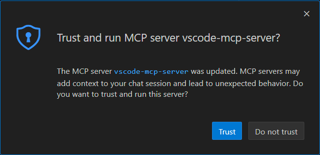 $ code --add-mcp '{"name":"vscode-mcp-server","command":"uvx","args":["mcp-server-fetch"]}' Added MCP servers: vscode-mcp-server