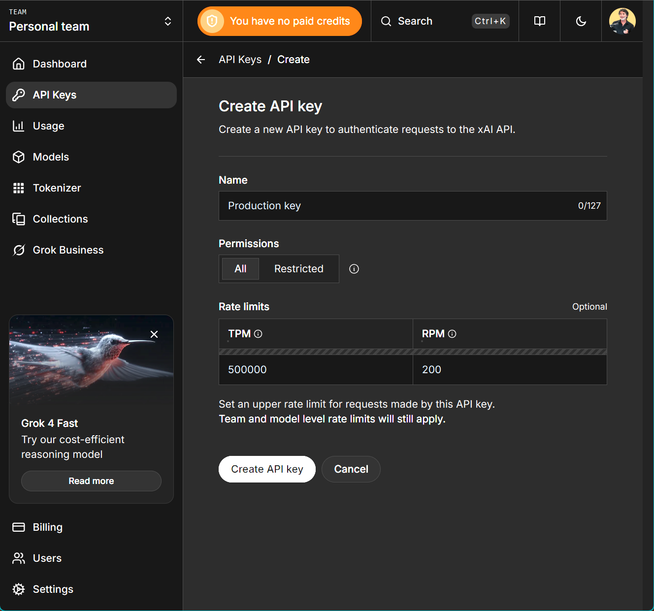 The Grok free tier works quite well. However, an API key is required to use a Visual Studio Code extension. The API requires credits.
