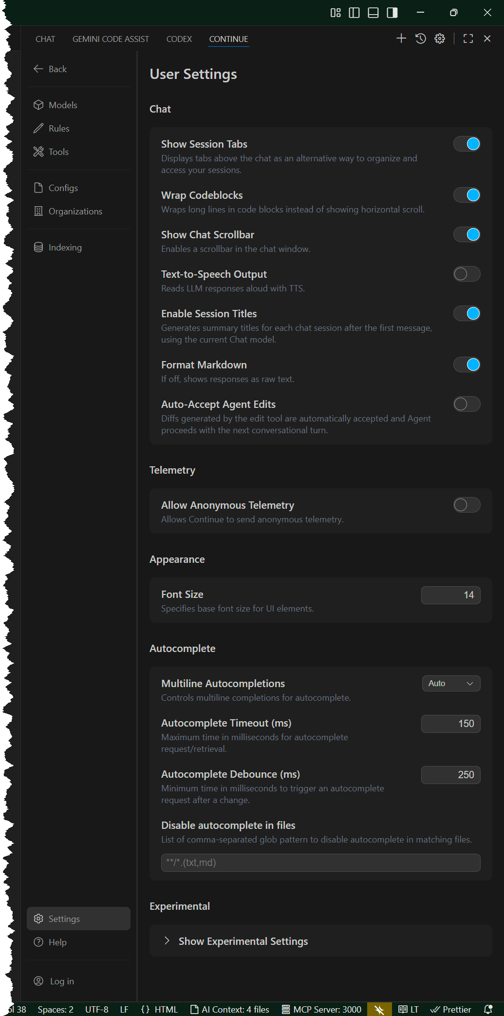 Continue.continueextension setup. - I enabled Enable Console and disabled Telemetry Enabled.