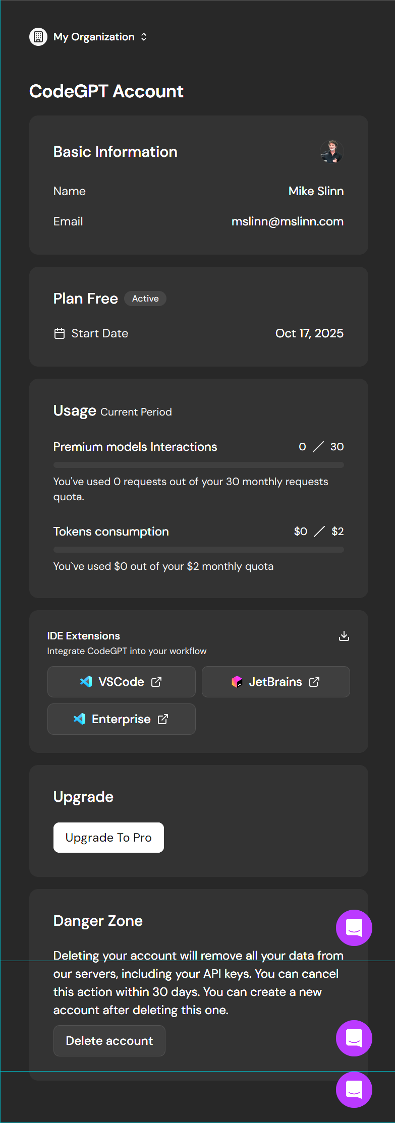 Clicking on the person icon at the top right of the CodeGPT panel displayed this in my web browser: