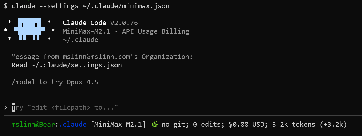 $ claude --settings ~/.claude/minimax.json